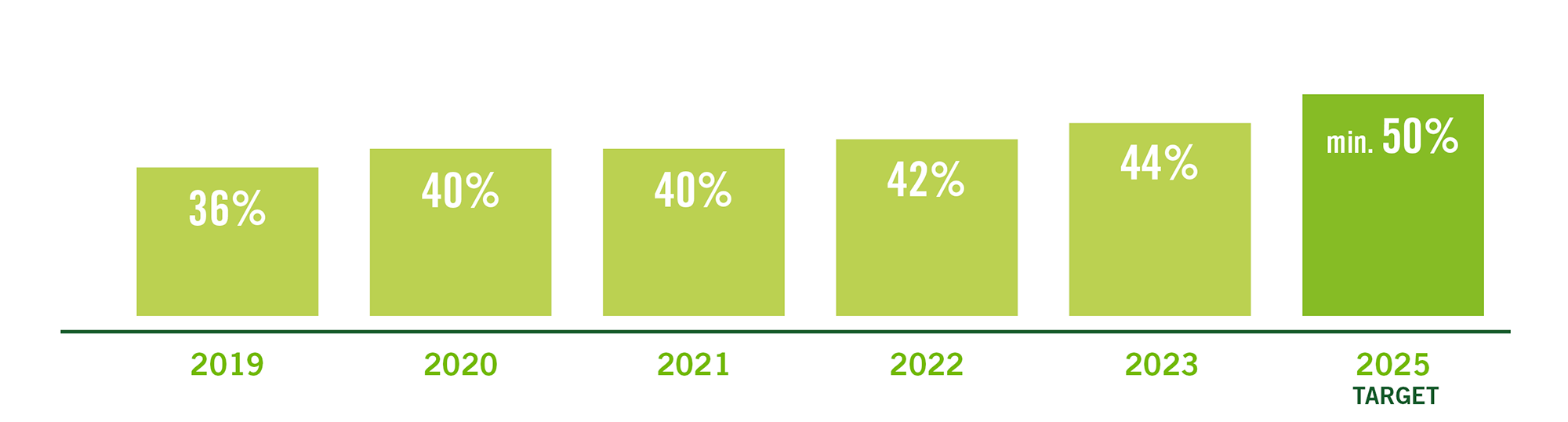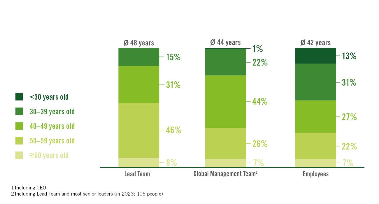 截至 2023 年底,在我们的全球管理团队中,女性占 39%,非德国人占 44%。我们公司的年龄结构,包括高管和经理的年龄结构,在所有年龄段都非常均衡。截至 2023 年底,我们的员工平均年龄为 42 岁。*