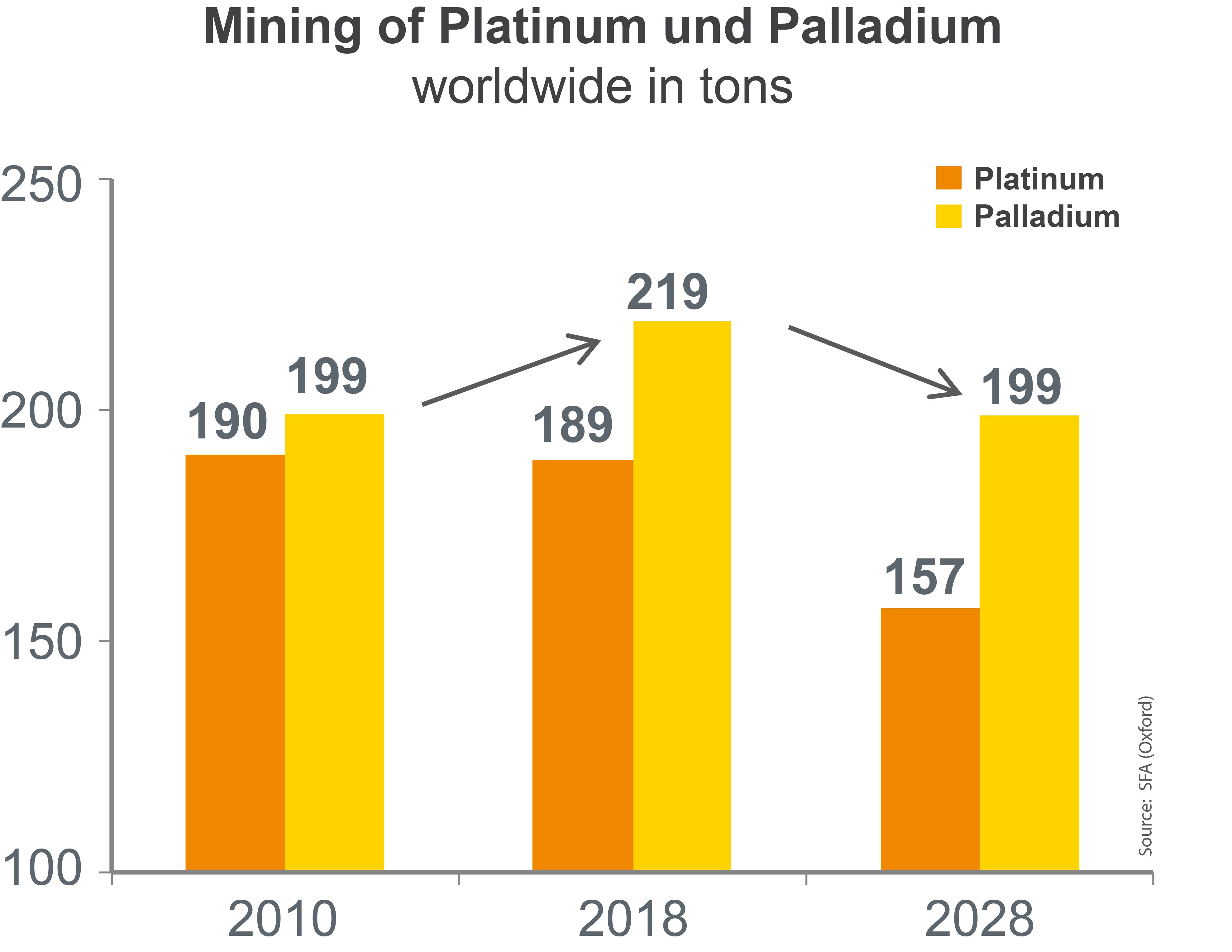 1. 未来十年,矿产矿山的铂钯产量将下降。铂族金属的回收利用将变得越来越重要。
