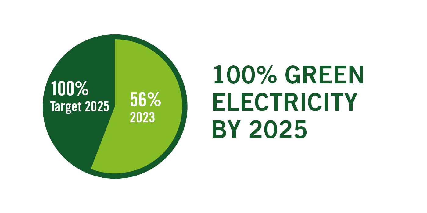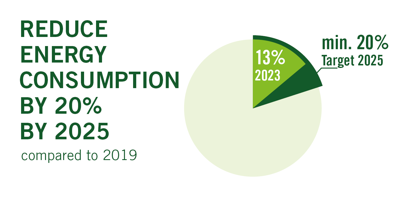 为了及时大幅降低能耗,我们为自己设定了两个雄心勃勃的阶段性目标,即到 2025 年。首先,我们的目标是实现 100% 的绿色电力需求。其次,我们的目标是在 2019 年的基础上减少 20% 的能源消耗。