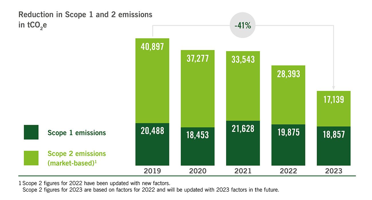 与2022年相比,2023年我们成功地将范围一和范围二的排放量减少了25%。自2019年以来,我们的排放量减少了41%,同时业务增长了47%。