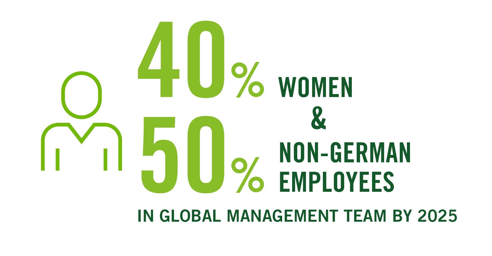 多元化始于高层。到2025年底,我们的全球管理团队中女性比例将至少达到40%,国际员工(非德国籍)比例将至少达到50%。*